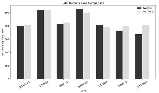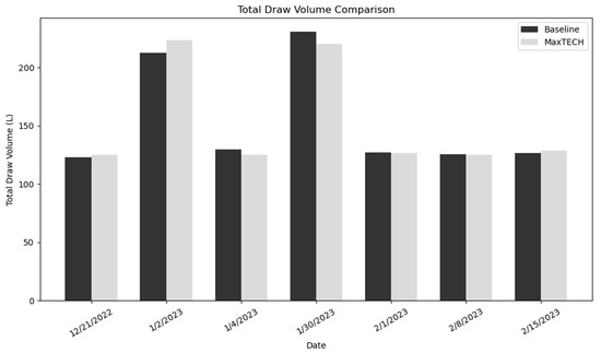 The unit total running time and the accumulated draw volume per day were calculated and presented in Figure 5. The accumulated low usage draws about 37 gal per day, whereas, for medium use, the total drawn volume is ~59–63 gal. Medium-draw patterns were emulated on 2 and 30 January 2023, whereas low-draw patterns occurred for the other presented days. The running time of the two units was approximately similar during the low-draw pattern except for 8 February 2023, where MaxTECH ran for 37 min longer than the baseline unit. On 2 January 2023, the running time for the medium-draw-pattern was approximately 517 min for both units. However, on 30 January 2023, the baseline unit ran for 29 min longer than the MaxTECH unit.