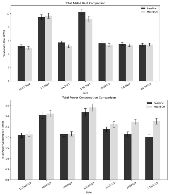 To further understand the performance of both systems, the total daily power consumption and the thermal energy added to the water tank are calculated and plotted in Figure 6. The power consumption is comparable daily for both units except on 8 February 2023, when MaxTECH consumed 0.56 kWh more than the baseline unit consumed. Interestingly, the total added heat for both units is similar. For the added water heating thermal energy, the baseline unit showed slightly higher added heat except for 4 January and 30 January 2023, when the baseline showed noticeably higher added heat by 0.56 and 1.0 kWh, respectively, as seen in Figure 6. The corresponding added heat for both units is comparable.