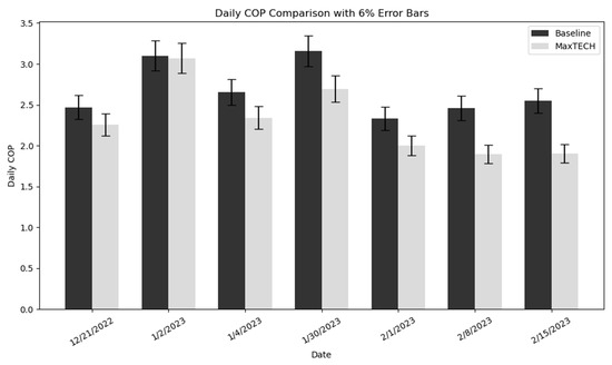 Daily coefficient of performance (COP) of the baseline and MaxTECH units for selected days in 2022 and 2023. The associated uncertainty is in the range of 6~10%.
