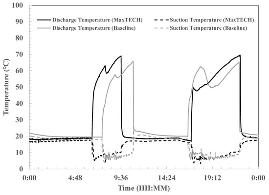 Suction and discharge refrigerant temperatures for the baseline and MaxTECH water heaters over a full 24-h day.