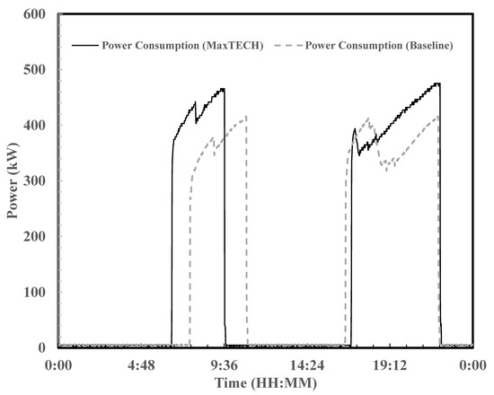 The power consumption measured for both units is plotted in Figure 9. The power consumption profiles followed the exact behavior of the suction and discharge temperatures in Figure 8. The MaxTECH unit used more energy than the baseline unit used in both stints of operation. This difference is reflected in the discharge temperatures, as seen in Figure 8.