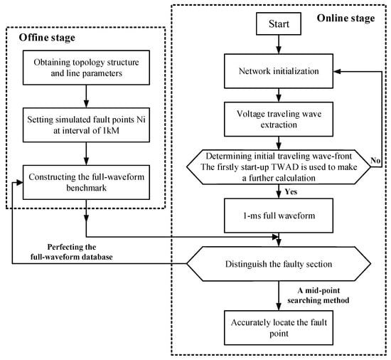 34] utilized an offline system to identify transient mid-frequency responses of fault systems, followed by fault location in online systems through fast Fourier transform (FFT), with the specific methodology illustrated in