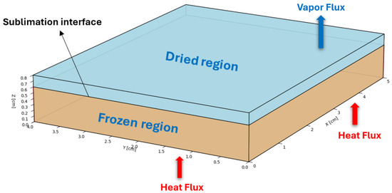 Owing to the symmetry of the trays and to reduce the computational time, a computational domain of 5 × 4 × 0.8 cm is considered, as shown in Figure 4. The drying process divides the computational space into two regions: the uppermost, desiccated layer and a lower, frozen layer. As sublimation occurs, the boundary between these zones gradually moves downward, causing the dry area to expand. The initial drying phase ends when this sublimation front reaches the bottom of the tray.