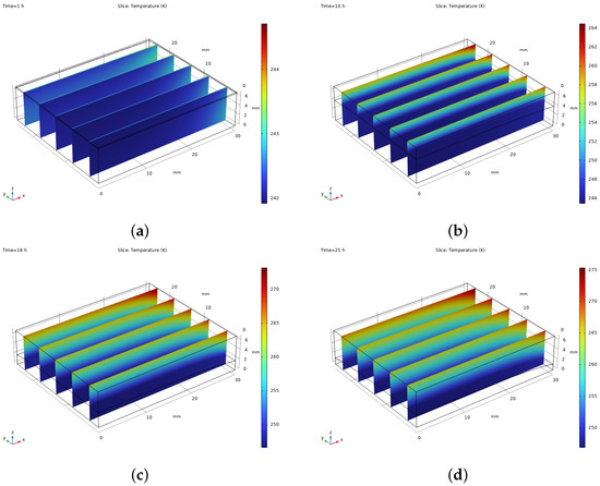 Figure 3 demonstrates a strong correlation between the numerical simulation results and the experimental temperature data. In the simulation, both cooling and heating from beneath the tray were implemented using a stepwise function.