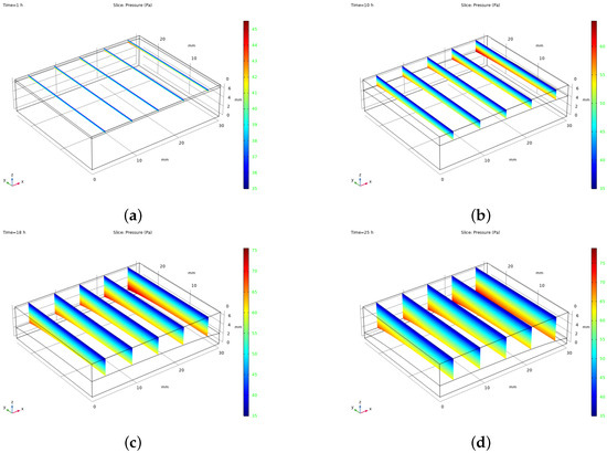 Vapour pressure distribution throughout the sublimation drying process at different time intervals: (a) 1 h, (b) 10 h, (c) 18 h, and (d) 25 h.