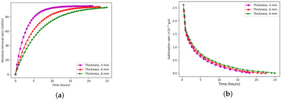 Effects of sample thickness on (a) moisture removal ratio and (b) sublimation rate during the vacuum sublimation drying process.