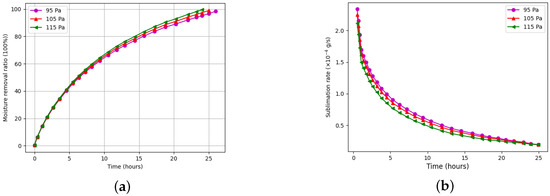 Effects of chamber pressure on (a) moisture removal ratio and (b) sublimation rate.