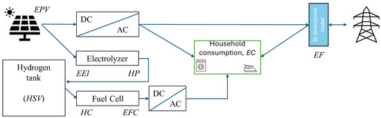 The above-mentioned issues related to battery storage suggest exploring solutions in other technologies, hence, the proposal to store household energy in hydrogen—Figure 1, and the energy calculation algorithm—Figure 2.