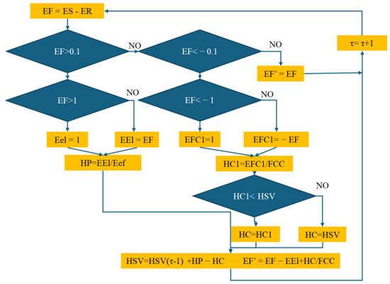 The algorithm for calculating HSV and EF’ is shown in the figure below. The input capacity of the electrolyzer and the output capacity of the fuel cell were assumed to be PH = 1 kW.
