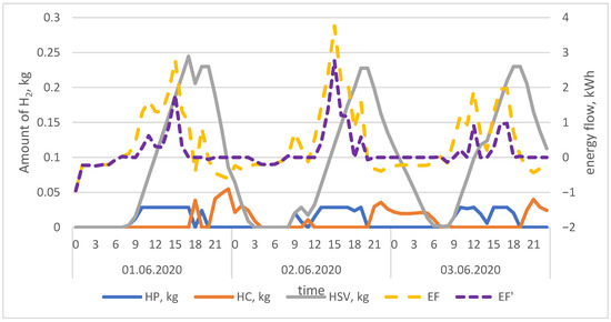 Quantitative (mass) hydrogen production and consumption, state of charge of the hydrogen storage, and energy flows in the installation—example for the period from 1 June 2020 to 3 June 2020. HP—hourly hydrogen production, HC—hourly hydrogen consumption, HSV—amount of hydrogen stored, EF—energy flow in the analyzed installation without hydrogen system (right-scale), EF’—energy flow with the hydrogen system (right-scale).