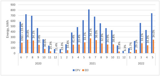 Energy production from PV (EPV), energy consumption (EC) for the analyzed household installation—real data from two-year period (2020–2022).