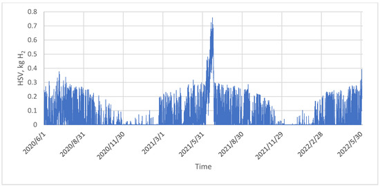 Hydrogen storage level (HSV—amount of hydrogen stored in the tank, kg) over two years, assuming unlimited storage capacity.