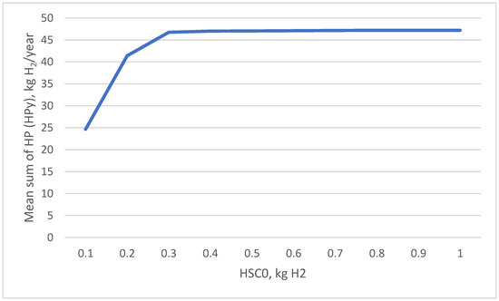 In the presented case study (research object), over a two-year period, increasing the hydrogen storage capacity beyond 0.7 kg resulted in no change in the amount of hydrogen produced annually (HPy). Additionally, the influence of storage on the maximum differences in energy flows was demonstrated (Figure 7).