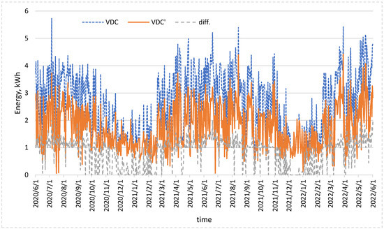 VDC value curve over two years, corrected by hydrogen storage (VDC’), and the difference before and after the hydrogen storage system.