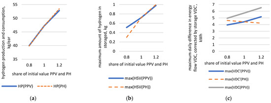 Sensitivity analysis of the following results: (a) average annual hydrogen production and consumption, (b) the maximum amount of hydrogen in storage, (c) the maximum daily difference in energy flow without storage (VDC) and with hydrogen storage (VDC’) as a function of the share of the initial values PPV = 5.04 kWp and PH = 1 kW.