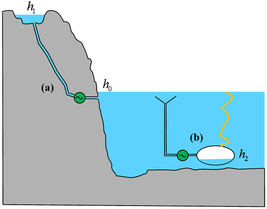 Another form of height exergy exists due to the reservoir being below the reference water level (h2 < h0), as illustrated in Figure 1b. This configuration represents the primary form of novel ocean-based PHSs. As hydropower development continues to expand, finding suitable locations for construction on land has become increasingly challenging. Additionally, rising costs associated with land acquisition and resettlement further exacerbate these difficulties. Ocean-based PHSs have gained investment interest due to their cost advantages, including the need for only a lower reservoir, the absence of long tunnels connecting upper and lower reservoirs, and the elimination of mountain access infrastructure. Although the initial investment in high-corrosion-resistant materials for seawater-based energy storage systems is relatively high, their extended service life and low maintenance costs contribute to an overall cost advantage over the project lifecycle. Furthermore, in coordinated operation with offshore wind farms, such systems effectively regulate wind power fluctuations, enhance the stability of the power system, and improve the penetration of renewable energy in island grids [23,24]. For low-head island applications, the introduction of wind-powered pumped storage systems (WP-PSSs) can maximize energy efficiency [25].