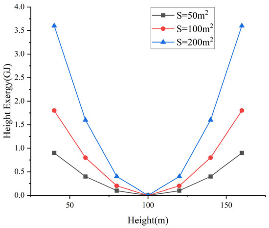 The characteristics of the stored height exergy described by Equation (4) are illustrated in Figure 2. In the figure, the reference level is set to h0 = 100 m. Under different cross-sectional areas, the relationship between the stored height exergy and height exhibits a parabolic distribution.