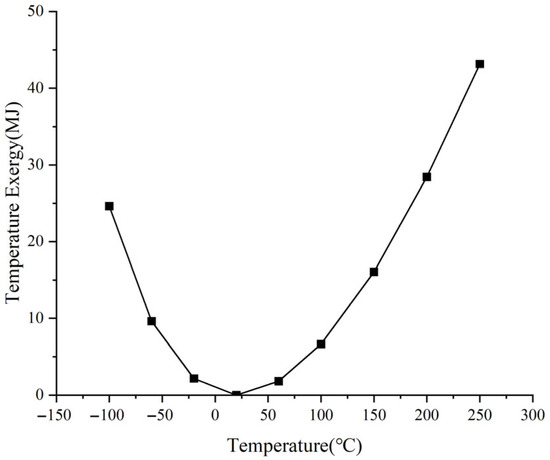 The characteristics of the temperature exergy described by Equation (9) are shown in Figure 4. In the figure, 1 kg of air is analyzed with the condition of T0 = 20 °C, CV = 716.4 J/K. It can be observed that the temperature exergy exhibits a nonlinear relationship with temperature.