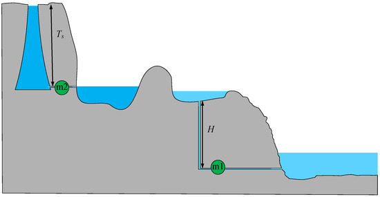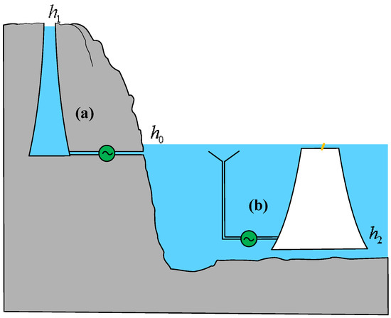 PHS systems have high efficiency in energy conversion, with a round-trip efficiency ranging from 70% to 75%. In Brazil, combining PHS with stepped hydropower dams can increase the overall energy storage efficiency to 90% [19]. In general, a significant height difference between the upper and lower reservoirs is usually required to create sufficient height potential energy reserves [20]. There are two main forms of expression for the height exergy of water in a PHS, as shown in Figure 1.