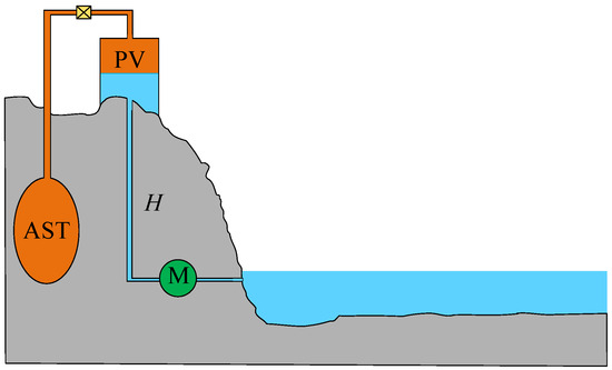 Figure 6 illustrates the schematic diagram of a typical hybrid PHS–CAES system. The hybrid PHS–CAES system features an air–water mixing pressure vessel (PV) positioned at a specific height. The PV is connected to the underground air storage tank (AST) via piping and valves. Both the PV and AST are pre-pressurized with a certain amount of air. During system operation, all connected valves are in the open position. The valves are closed to ensure that there is no gas leakage in the AST between the energy storage process and the power generation process. During energy storage, a motor (M) drives pump to draw water from a lower reservoir into the PV, compressing the air within the PV and AST until all the air in the PV is transferred to the AST, leaving the PV fully filled with water. The power generation process operates in reverse.