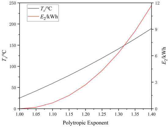 Under different heat transfer coefficients in the PV, the air compression process exhibits a polytropic process. The final temperature and temperature exergy corresponding to the polytropic exponent are shown in Figure 9.