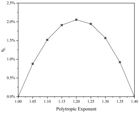 Due to irreversible heat exchange processes occurring during the polytropic process, the theoretical available work exceeds the energy storage capacity. The relationship between the proportion of losses and the polytropic exponent is shown in Figure 9.