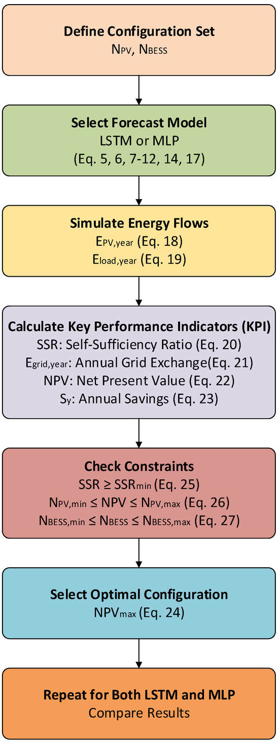 The optimization approach used in this study is based on extensive research and systematically evaluates all feasible PV and battery size combinations. For each possible combination of PV and BESS sizes, the simulation utilizes the load forecasts generated by the LSTM or MLP models (see Equations (7)–(14), (16), and (19)) to compute the monthly and annual energy flows within the microgrid. Subsequently, the model evaluates key performance indicators for each configuration, including self-sufficiency, grid exchange, and economic metrics, as defined by Equations (20)–(25). The optimal configuration is identified as the one that maximizes NPV while simultaneously satisfying the operational and design constraints specified in Equations (27)–(29). This optimization procedure is independently applied using both LSTM- and MLP-based forecasts, thereby enabling a direct comparison of the performance of the proposed LSTM on system sizing and economic performance. An overview of the algorithmic workflow is illustrated in Figure 1.