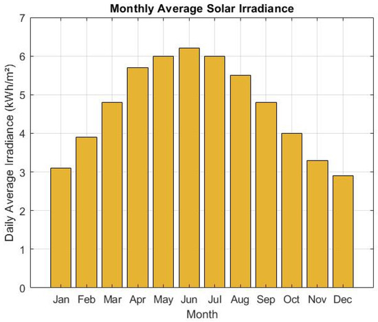 Figure 2 shows that the monthly average solar irradiance in South Carolina peaks at 6.2 kWh/m2/day in June and remains above 5.0 kWh/m2/day from April through August. The lowest values are observed in December (2.9 kWh/m2/day) and January (3.1 kWh/m2/day). This seasonal variation means that PV generation potential is highest in summer, supporting greater self-sufficiency, while winter months require increased grid reliance. For example, the difference between the highest and lowest monthly irradiance is 3.3 kWh/m2/day, which directly impacts monthly PV output and system sizing.