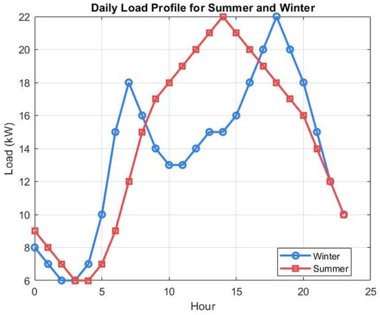 The load forecasts used in the simulation are generated by the LSTM and MLP models described in Section 3. The input data are first normalized using min–max scaling, as in Equation (5). Input sequences are constructed as in Equation (6). The LSTM model uses the cell operations defined by Equations (9)–(14), while the MLP model uses the neuron output defined by Equation (19). Both models are trained by minimizing the mean squared error, as in Equation (15), and their predictive performance is evaluated using RMSE and MAPE, as in Equations (17) and (18). After training, the predicted normalized values are denormalized using Equation (16) to obtain the actual load values used in the simulation.
