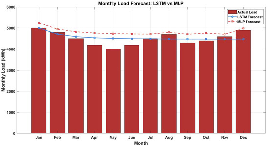 These metrics provide a quantitative assessment of the model’s predictive performance. As shown in Equation (8), both models use past load values to predict future demand, enabling the microgrid optimization framework to dynamically adapt to changing consumption patterns. The denormalized forecasts from Equation (16) are used as inputs for PV and BESS sizing, ensuring that the system is neither over- nor under-dimensioned. While LSTM is particularly effective at capturing temporal dependencies, MLP provides a useful benchmark for comparison.