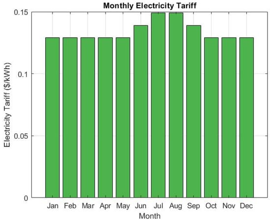 The microgrid maintains a grid connection to ensure supply reliability during periods of insufficient PV generation or high load demand. The grid acts as both a backup energy source and a potential sink for excess PV generation, depending on local net metering policies. In this study, the grid is modeled as an infinite bus with fixed voltage and frequency, capable of supplying or absorbing any required power within the limits of the local distribution network. The electricity tariff structure is based on the average residential rates for South Carolina, US, as reported by the U.S. Energy Information Administration (EIA). Grid import and export are tracked monthly to assess self-sufficiency and economic performance.