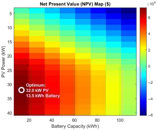 The economic performance of each configuration is assessed using the NPV, which accounts for the initial investment, operational costs, major component replacements, and annual savings over the project lifetime, as shown in Equation (24):