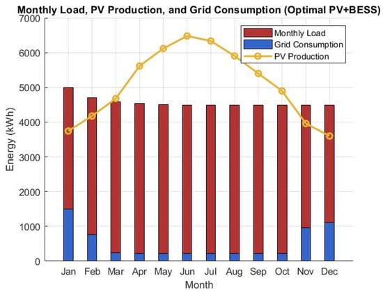 Monthly load, PV production, and grid consumption (optimal PV + BESS).