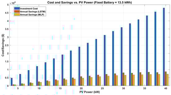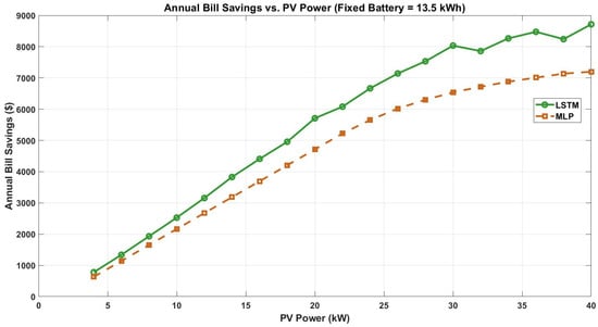 Figure 9 illustrates the impact of increasing PV system size on annual bill savings for a fixed battery capacity of 13.5 kWh. This figure shows that annual bill savings rise sharply as PV capacity increases from 5 kW (approximately USD 1200/year savings) to 32 kW (reaching about USD 8000/year with the LSTM-based approach). Beyond 32 kW, the savings curve flattens, indicating diminishing returns for further PV expansion; for example, increasing PV size to 40 kW yields only a slight additional gain, with annual savings remaining close to USD 8500. In contrast, the MLP-based approach consistently results in lower savings across all PV sizes, with a maximum of about USD 6000/year at 32 kW. The gap between LSTM and MLP results widens as PV size increases, highlighting the superior economic performance enabled by more accurate load forecasting. Overall, this figure demonstrates that optimal PV sizing is crucial for maximizing economic benefit and that advanced forecasting with LSTM not only increases total savings but also ensures that investments in larger PV systems are fully leveraged. This underscores the importance of both accurate demand prediction and careful system sizing in PV-battery microgrid design.