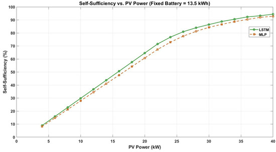 Figure 10 demonstrates the relationship between PV size and self-sufficiency for the same fixed battery capacity. Self-sufficiency rises from 40% at 4 kW PV to 88.8% at 32 kW PV (LSTM-based). Further increases in PV size yield only minor gains, with self-sufficiency reaching a maximum of 90% at 40 kW. The MLP-based results are consistently lower, with a maximum self-sufficiency of 72% at optimal sizing. This confirms that PV size is the primary driver of self-sufficiency.
