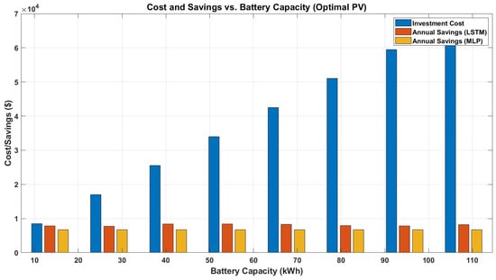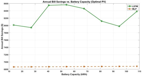Figure 13 details the relationship between battery capacity and annual bill savings. The marginal benefit of additional storage is minimal. LSTM-based analysis provides higher savings than MLP even as battery capacity increases. This figure demonstrates that while the highest annual bill savings with LSTM-based forecasting are achieved at battery capacities around 41–54 kWh, the increase in savings compared to a 10 kWh battery is relatively modest (approximately USD 8000 at 13.5 kWh vs. a peak of USD 8550 at 41–54 kWh). Given the significant additional investment required for larger battery capacities, the marginal gain in annual savings does not justify the extra cost. Therefore, selecting a 13 kWh battery represents a cost-effective and rational choice, capturing the majority of the achievable economic benefit while avoiding unnecessary capital expenditure. This result confirms that, under the studied conditions, a single Powerwall unit provides an optimal balance between investment and savings.