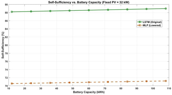 Figure 14 further illustrates that self-sufficiency increases only slightly with additional battery capacity, confirming that the system is already near its maximum achievable self-sufficiency with the selected PV size. Specifically, self-sufficiency with LSTM-based forecasting is already high at around 88% with a 13.5 kWh battery and rises only marginally—to approximately 89%—even as battery capacity increases up to 120 kWh. In contrast, the MLP-based approach remains much lower, around 71–72%, regardless of battery size. This indicates that PV size is the dominant factor for self-sufficiency in this scenario and that LSTM-based sizing provides a more robust and effective solution, while larger batteries offer only minimal additional benefits.