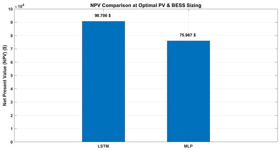 Figure 15 quantitatively validates the superiority of the LSTM-based approach over the MLP method. With LSTM-based optimization, the system achieves an annual bill saving of USD 6514, an annual self-sufficiency of 88.8%, and an NPV of USD 90,706 under the optimal configuration (32 kW PV, 13.5 kWh battery). In contrast, the MLP-based system produces lower values—an annual bill saving of USD 5200, an annual self-sufficiency of 72%, and an NPV of USD 75,967 under its own optimal PV and BESS size.