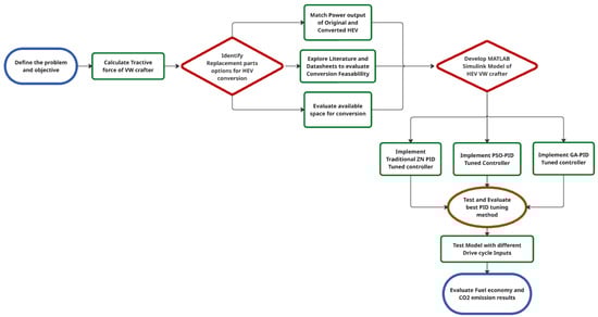 This study describes a systematic approach to the research objectives, such as converting a Volkswagen Crafter into a series–parallel hybrid electric vehicle (HEV). We begin by analyzing the vehicle power output through tractive force calculation and then select suitable replacement parts, such as electric motors, batteries, and mechanical coupling devices. A detailed MATLAB Simulink R2024b model combining the existing ICE with new electric components is then developed for HEV simulation. Using this systematic approach, all relevant aspects are taken into consideration, starting from hardware selection to simulation fidelity. The methodology is summarized visually in the flowchart in Figure 1, where each sequential step is listed.