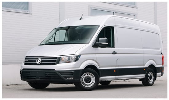 - Technische Daten–Volkswagen Crafter. Volkswagen Nutzfahrzeuge. 2022. Available online: https://www.volkswagen-nutzfahrzeuge.de/de/modelle/crafter/technische-daten.html (accessed on 10 April 2025).