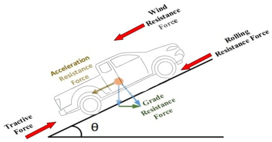The main forces [N] of resistance that act on a vehicle are the acceleration resistance (Fa), aerodynamic drag force (Fad), rolling resistance (Frr), and grade resistance (Fgrade) (as represented in Figure 3).