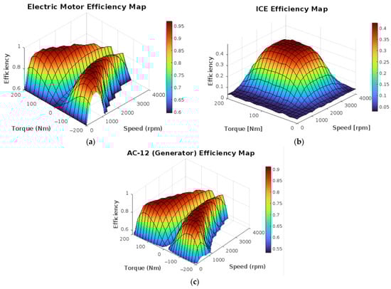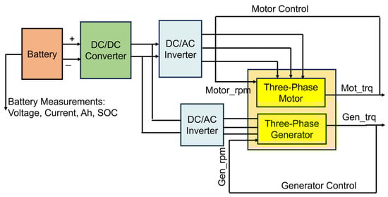 The AC-12 was chosen for its compact size and suitable output. Its 279 × 181 mm envelope is much smaller than the AC-50 traction motor (210 × 200 mm, 52 kg), so it can be packaged next to the engine where space was freed up (the 1.5 L engine is shorter, leaving ~120 mm clearance). Its 28 kW continuous rating (≈117 Nm) matches that of similar generators used successfully in simulated HEVs for range extension, as in [32,34]. In our series–parallel layout, the AC-12 acts as the engine’s generator (analogous to Toyota’s MG1), while the AC-50 remains the traction motor (MG2). Both run on the same 72 V DC bus (fed by the 360 V BMW i3 battery through a DC/DC converter), simplifying integration. The AC-12’s built-in encoder and brushless design make control straightforward. In short, it fits the size envelope, is commercially available as an EV conversion motor, and provides the required ~30 kW class output for our hybrid system [31].