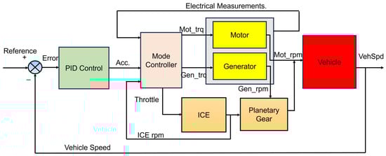 - Control strategy optimization—power distribution between the ICE and electric motor by tuned PID controllers with modern optimization algorithms.