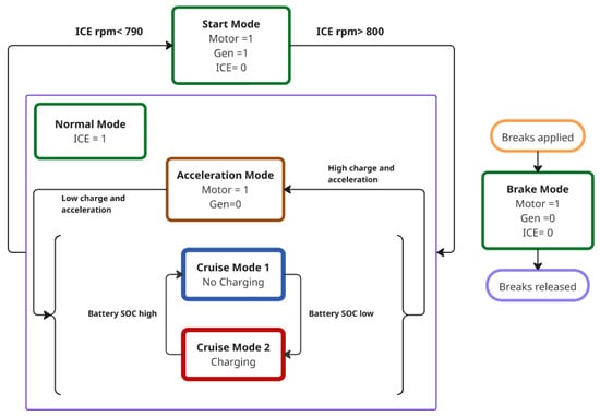 An energy management strategy (EMS) determines how to allocate power between the ICE, battery, and motors to minimize fuel consumption. The EMS approach is broadly classified into four categories: rule-based heuristics, global optimization, predictive control, and learning-based methods. Rule-based control employs simple logic (e.g., charge-depleting vs. charge-sustaining modes, and predefined maps) for real-time control. In contrast, optimization-based methods compute an optimal policy offline or online. A standard benchmark is Dynamic Programming (DP), which yields the global optimum fuel economy for a given drive cycle [8]. Advanced strategies include Model Predictive Control or Pontryagin’s Minimum Principle. Recent works explore artificial intelligence approaches. The key categories used in [8,9,10] include: