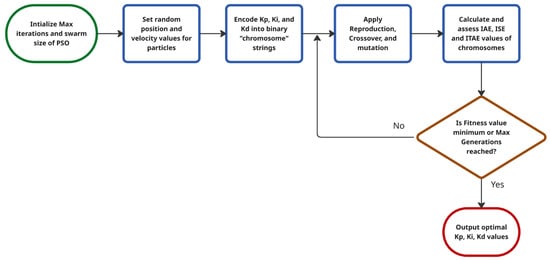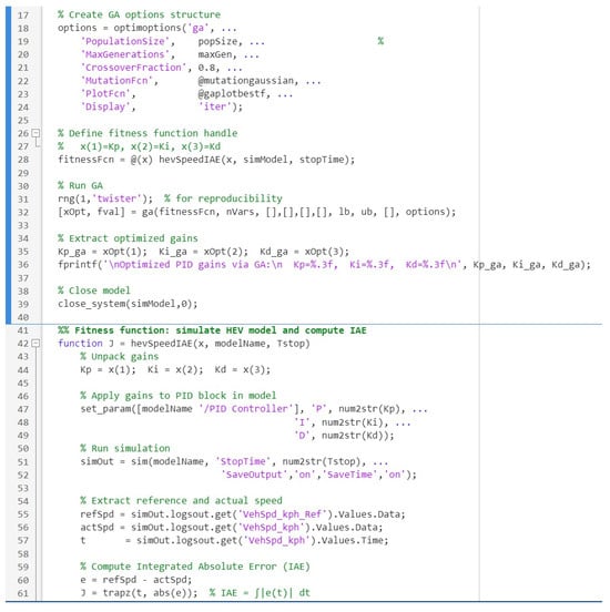 After the Simulink model development was completed, various PID tuning methods were applied to optimize the control strategies for power management between the ICE and electric systems. GA and PSO were compared to determine the more effective tuning algorithm for HEV application, aiming to maximize efficiency. The proposed strategies were tuned several times to verify performance, fuel economy, and emission results.