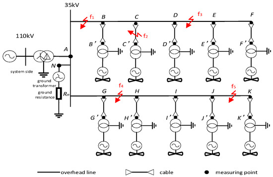 To demonstrate the fault zone identification criteria, the simplified wind farm model illustrated in Figure 1 is employed. Dual measurement nodes (A/B/C and A’/B’/C’) along the collector lines synchronously acquire three-phase electrical parameters and zero-sequence waveforms from respective branches [14,15,16,17].