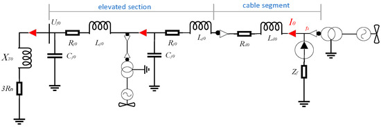 In Figure 3, is the impedance value per unit distance of the cable line; is the impedance value per unit distance of the overhead line; is the distance of the overhead line; is the distance of the cable line; is the ground impedance; and is the zero-sequence reactance of the ground transformer. The cable line resistance equivalently models the overhead line resistance according to Formula (4), maintaining identical impedance characteristics.