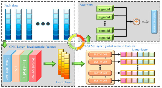 The CNN–BiLSTM–attention model operates through the coordinated integration of three core modules: (1) a convolutional neural network (CNN) for the extraction of spatial features from the input data; (2) a bidirectional long short-term memory (BiLSTM) network—comprising forward and backward LSTM layers—to capture bidirectional temporal dependencies and address challenges associated with long sequence modeling; and (3) an attention mechanism that assigns adaptive weights to the BiLSTM outputs, thereby emphasizing salient temporal features. This architecture effectively combines the spatial feature extraction capabilities of the CNN, the contextual modeling strength of BiLSTM, and the feature selection advantage of the attention mechanism, resulting in significant improvements in model accuracy and fault localization performance [24]. The overall model architecture is illustrated in Figure 5.