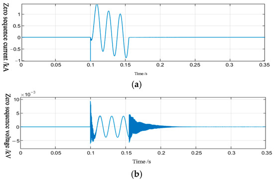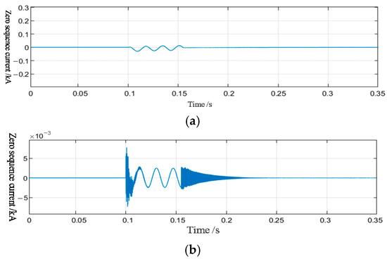 Zero-sequence waveform of fault point. (a) Zero-sequence current waveform. (b) Zero-sequence voltage waveform.