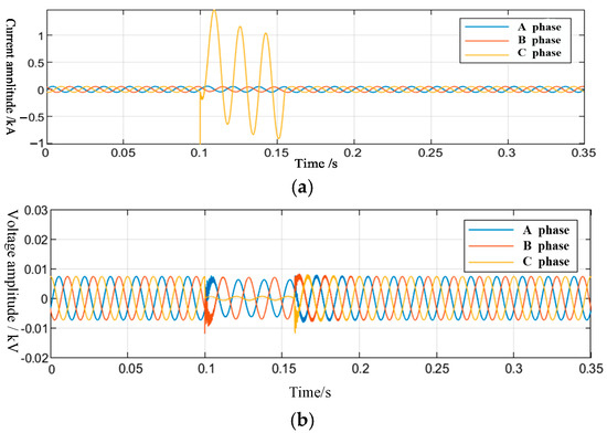 Three-phase waveform measured at the fault point. (a) Three-phase current waveform. (b) Three-phase voltage waveform.